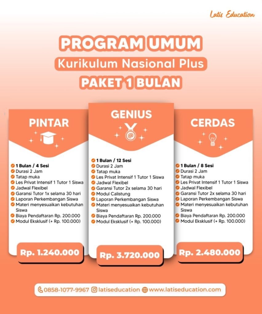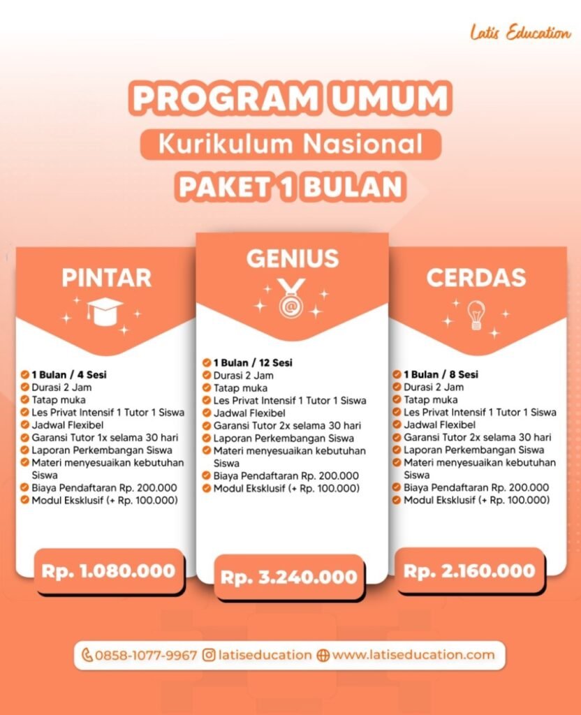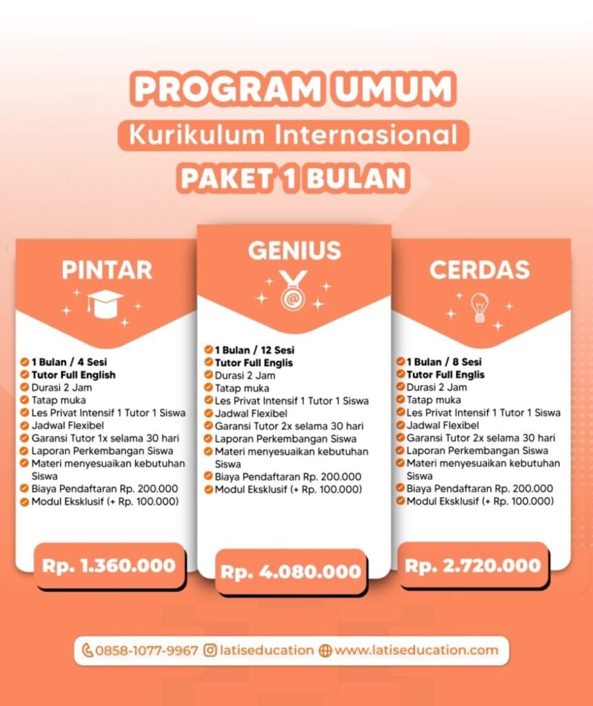 Latis Education menawarkan berbagai pilihan paket program, mulai dari program reguler hingga program intensif. Paket reguler biasanya mencakup jadwal belajar mingguan dengan durasi standar, sementara paket intensif dirancang untuk persiapan masuk sekolah dasar atau kebutuhan khusus dalam waktu singkat. Paket intensif umumnya memiliki biaya lebih tinggi karena melibatkan lebih banyak sesi pembelajaran dalam waktu singkat.